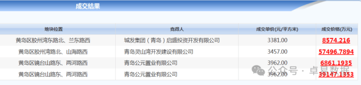 城发集团(青岛)启盛投资开发有限公司竞得1号地块,总价0.86亿,楼板价3381元/㎡;青岛灵山湾开发建设有限公司竞得2号地块,总价5.75亿,楼板价3457元/㎡。