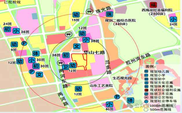2、教育与医疗:现状周边有6处幼儿园,5所小学,4所初中,2处高等教育用地;现状周边有1处区级社会福利院(西海岸社会福利院,改扩建2400床),规划1处区级综合医院(330床)、1处社区卫生服务中心。