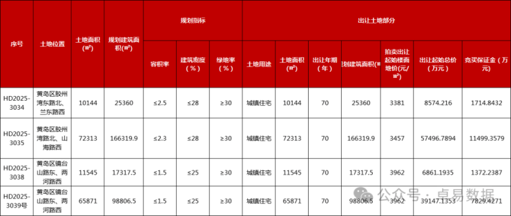 2号地块位于黄岛区镜台山路东、两河路西,占地65871㎡,建面98806.5㎡,容积率1.5,建筑密度≤25%,绿地率≥30%,拍卖起始楼面地价3962元/㎡,起始总价3.91亿,竞买保证金7829.4271万,保证金缴纳比例为20%。