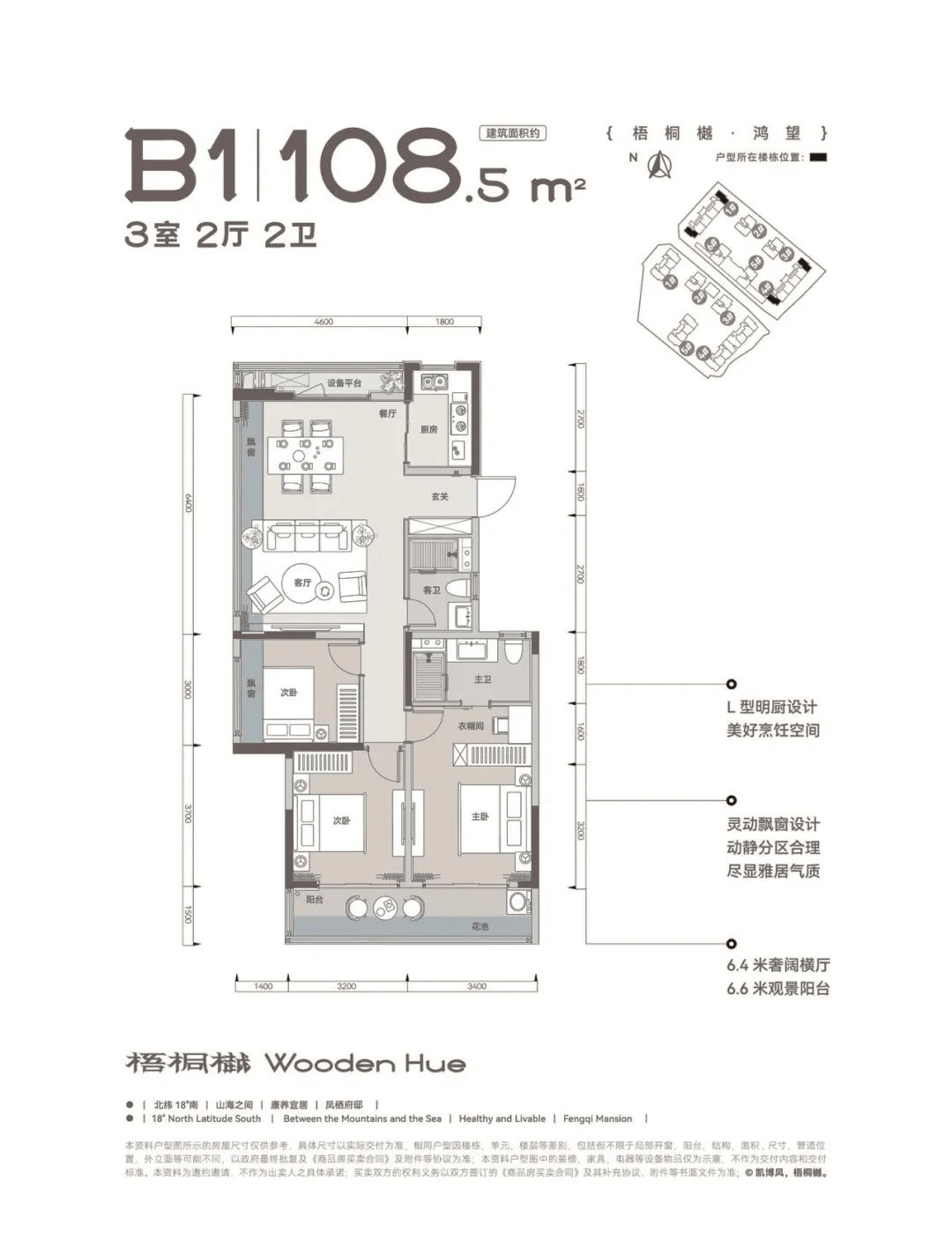 L 型明厨设计,为业主打造美好烹饪空间。动静分区合理,6.4 米奢阔横厅搭配 6.6 米观景阳台,让客厅空间更加开阔,视野极佳。灵动飘窗设计,为卧室增添了一份优雅气质,尽显雅居风范。