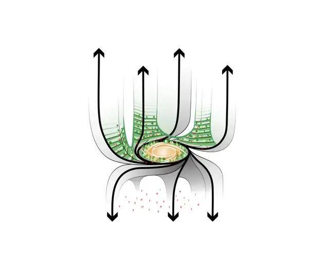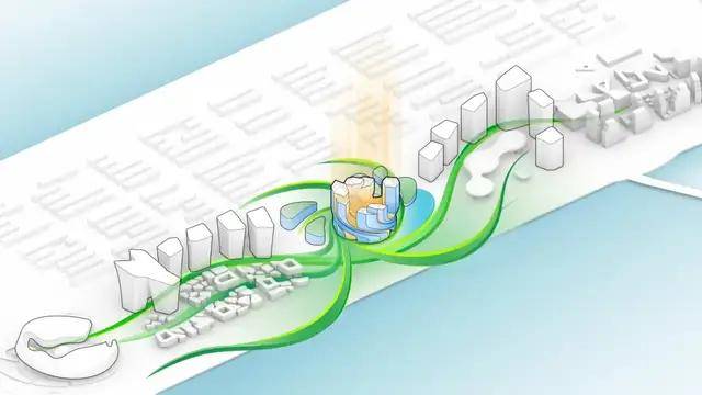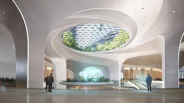 建筑中央的“智慧之源”向下延伸,形成开阔的大堂空间,并与地面的“城市论坛”相连,促进公众与企业的互动交流。