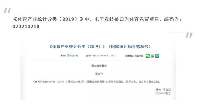 国家统计局正式将电子竞技归为体育竞赛项目,与足球、篮球、排球、棒球、乒乓球、羽毛球、拳击、马拉松、围棋归为一类运动项目。